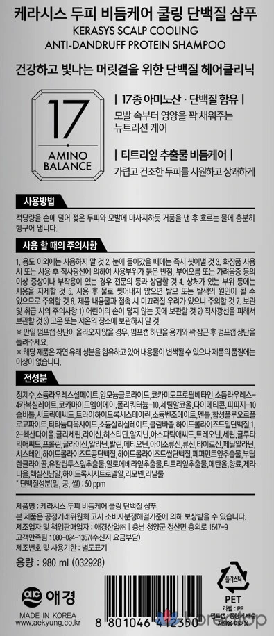 Охлаждающий протеиновый шампунь KeraSys для ухода за кожей головы и борьбы с перхотью, 980 мл, 1 шт.