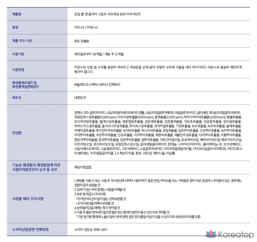 Освежающий охлаждающий шампунь для кожи головы Kundal Cool & Clear с ароматом аквамяты, 500 мл, 1 шт.