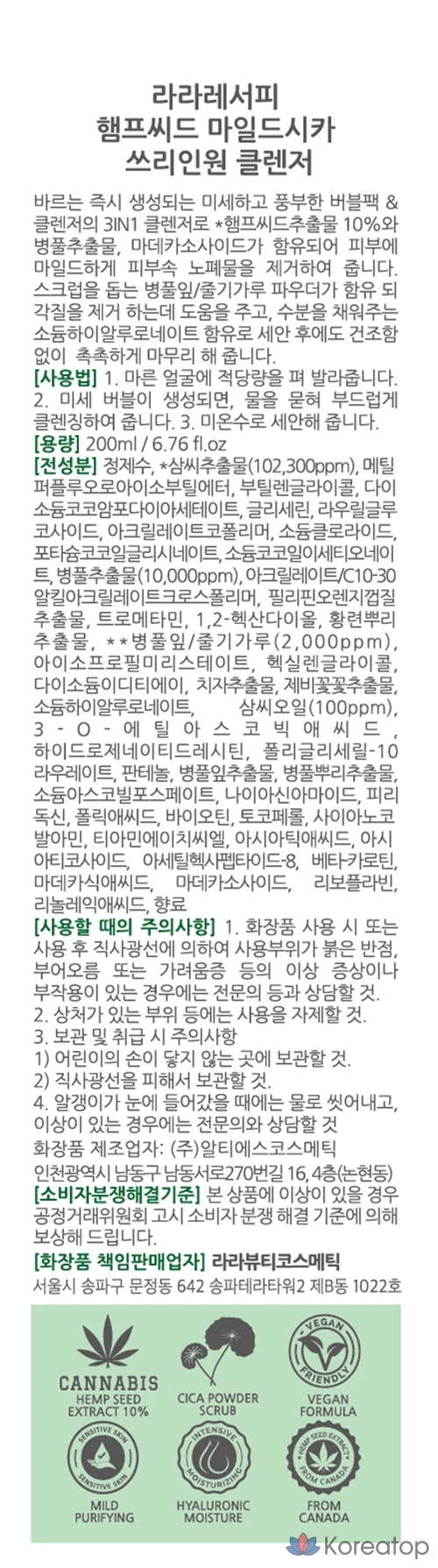 Очищающее средство LALARECIPE Hemp Seed Mild Cica 3-в-1, 200 мл, 1 шт.