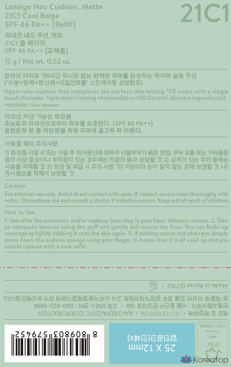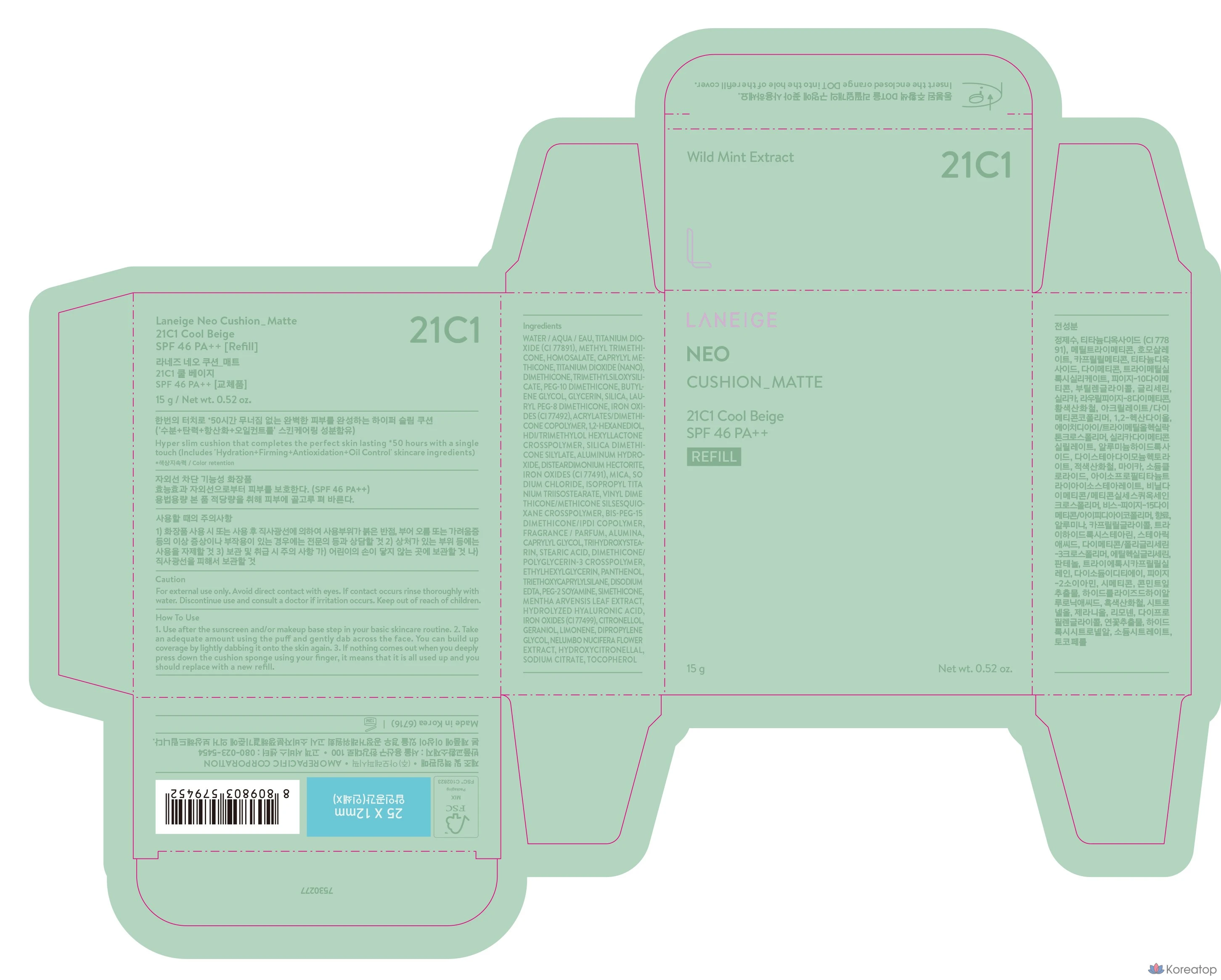 Сменный блок тональной основы Laneige Neo Matte Cushion Foundation 15 г, оттенок 21C1 Cool Beige