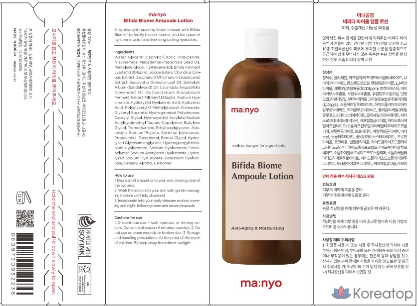Ампульный лосьон Manyo Factory Bifida Biome создан для глубокого увлажнения и восстановления кожи. Его формула обогащена бифидобактериями, которые способствуют укреплению кожного барьера и защите от внешних агрессоров. Лосьон легко впитывается, оставляя кожу мягкой и сияющей. Натуральные компоненты обеспечивают антиоксидантный эффект, помогая бороться с признаками старения. Идеально подходит для ежедневного ухода за кожей любого типа. 🌿💧