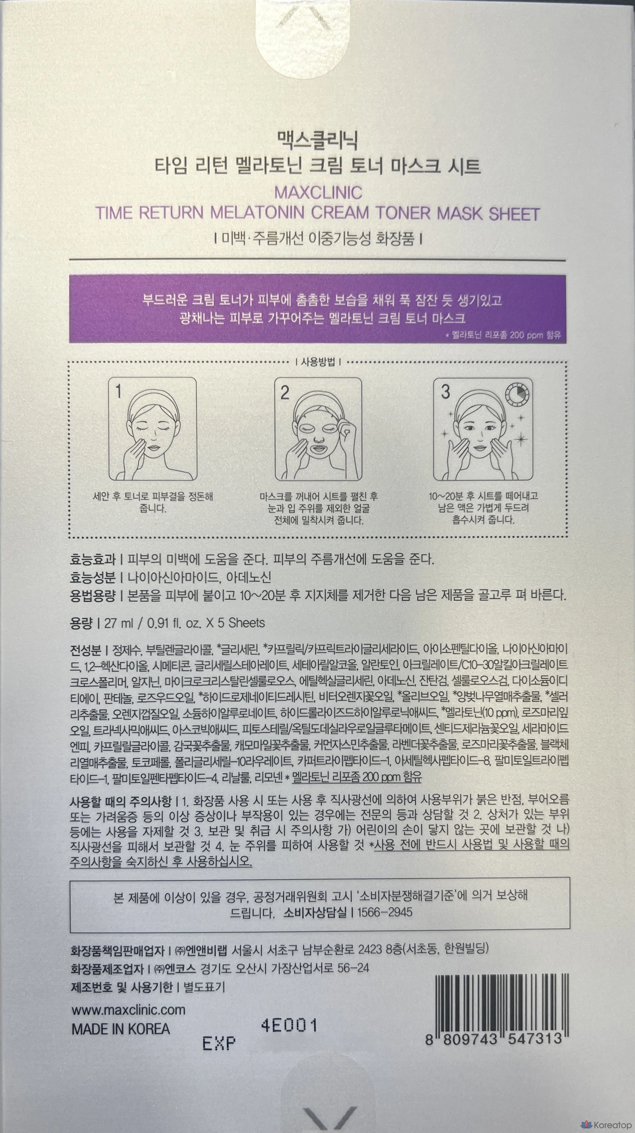 Тканевые маски-тоники с мелатонином MAXCLINIC Time Return, 5 шт., 1 упаковка