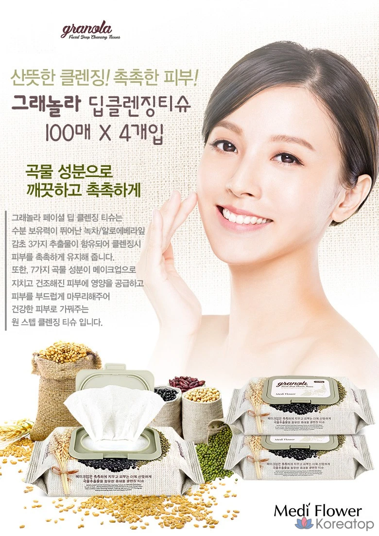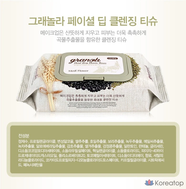 Очищающие салфетки Medi Flower с натуральными злаками обеспечивают бережное удаление макияжа и загрязнений с кожи. Удобная упаковка содержит 100 салфеток, что делает их идеальными для ежедневного использования. Благодаря мягкой текстуре и экологичному материалу, они подходят для всех типов кожи, включая чувствительную. Эти салфетки помогут сохранить вашу кожу чистой и свежей в любое время дня. 🌿