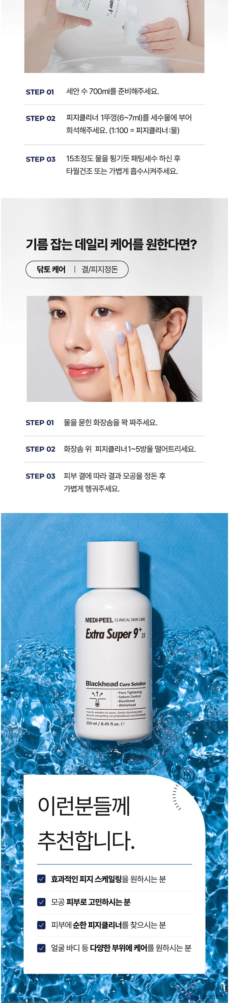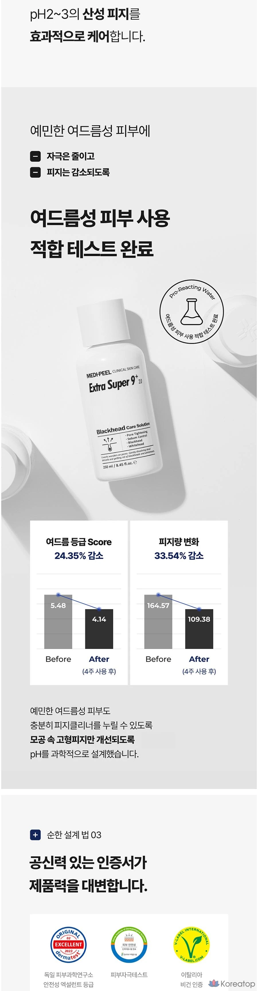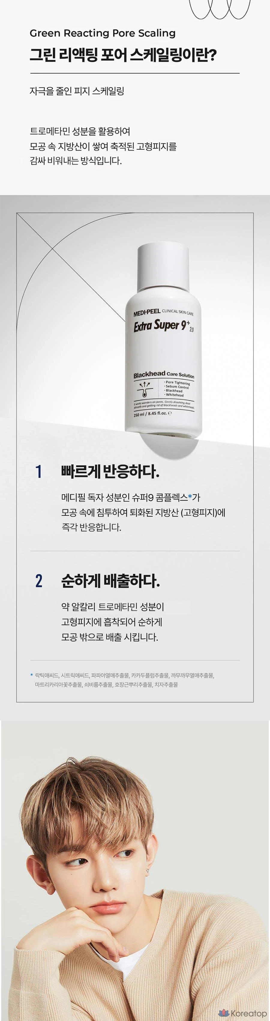 Medi-Peel Extra Super 9 Plus 2.0 — обновлённое очищающее средство для удаления чёрных точек, эффективно очищающее поры и нормализующее работу сальных желёз. Благодаря комплексу кислот (AHA, BHA, PHA) средство деликатно отшелушивает кожу, выравнивая её тон и рельеф. Растительный комплекс Pore 9 оказывает антибактериальное действие и уменьшает следы постакне. Бутил авокадат снижает выработку себума, предотвращая появление жирного блеска. Комплекс из 9 пептидов повышает эластичность кожи и способствует сужению пор. Продукт имеет сертификацию Vegan V-label, подтверждающую этичное производство без испытаний на животных. 🌱