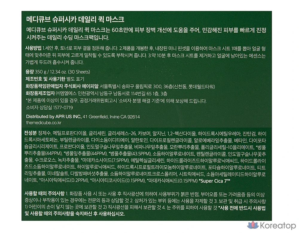 Ежедневная быстрая маска Medicube Super Cica, 30 шт., 1 упаковка