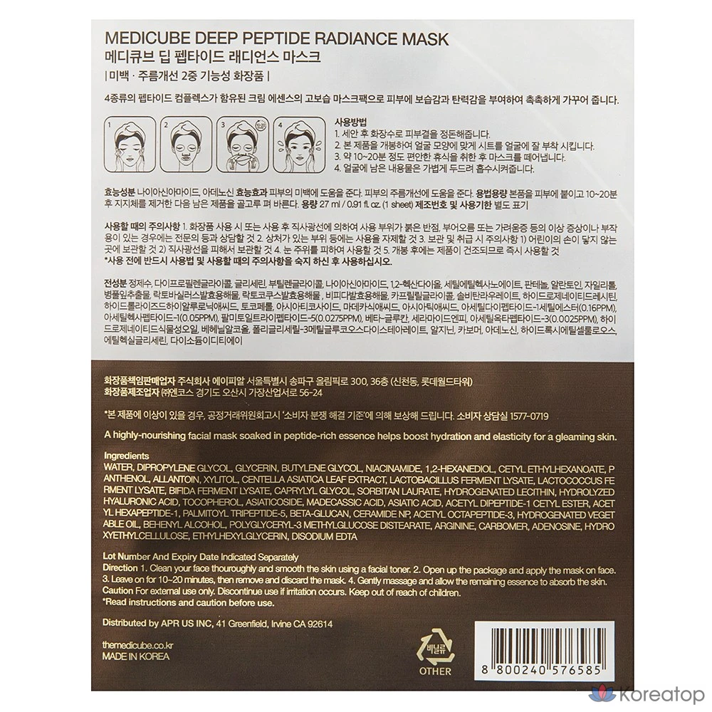 Маска для сияния кожи Medicube Deep Peptide Radiance Mask, 1 упаковка, 1 шт.