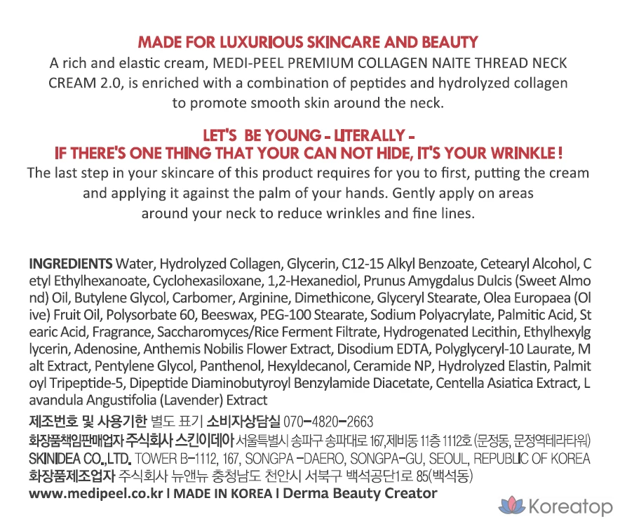 Крем для шеи MediPeel Premium Collagen Naite Silk 2.0 разработан для интенсивного ухода за кожей шеи, обеспечивая ей упругость и эластичность. Благодаря высокому содержанию коллагена, он помогает уменьшить видимость морщин и улучшает текстуру кожи. Легкая формула быстро впитывается, не оставляя жирного блеска, и подходит для ежедневного использования. Натуральные ингредиенты в составе обеспечивают бережный уход, делая кожу более гладкой и сияющей. Этот крем станет отличным дополнением к вашему ежедневному уходу за кожей. 🌿