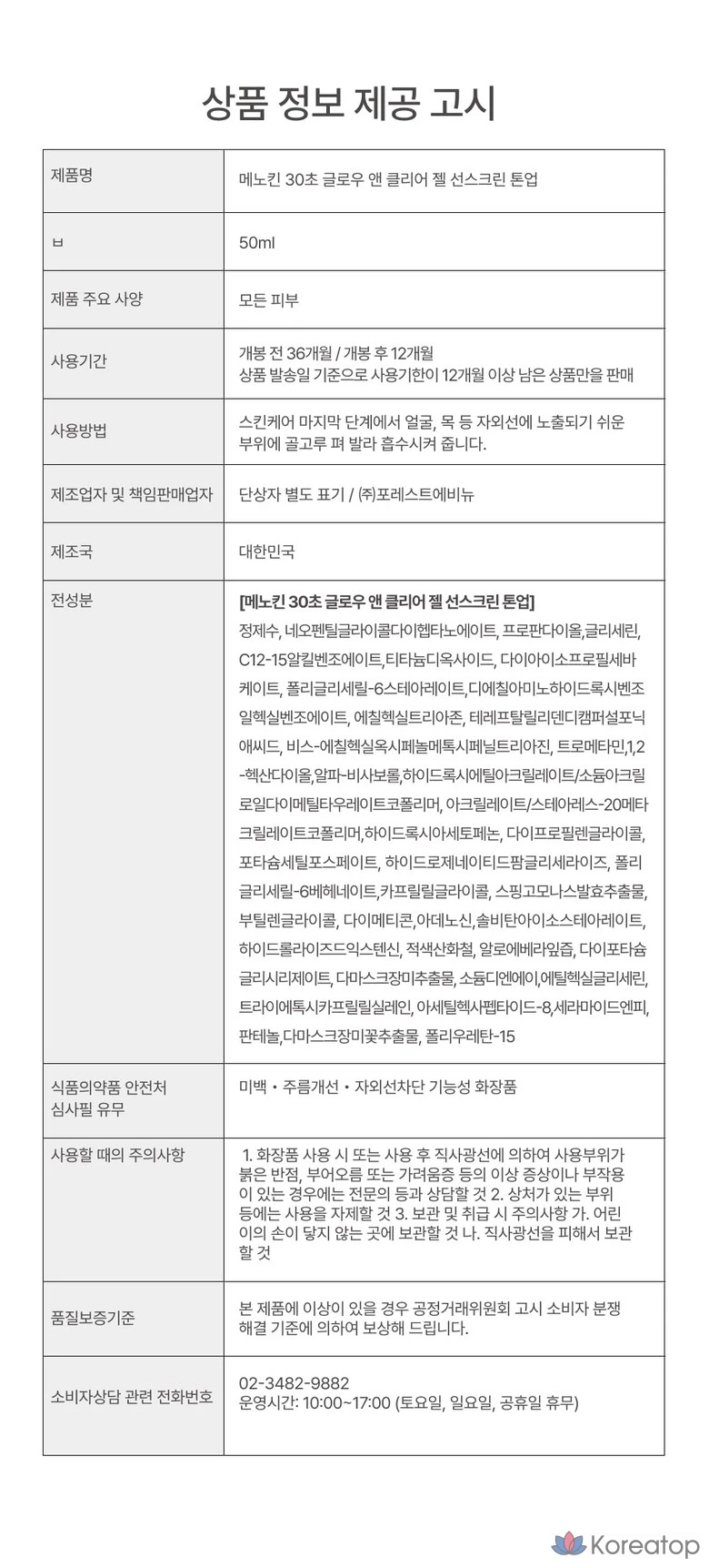 Menokine 30-Second Glow & Clear Gel Sunscreen Tone-Up SPF50+ PA++++, 1 шт., 50 мл