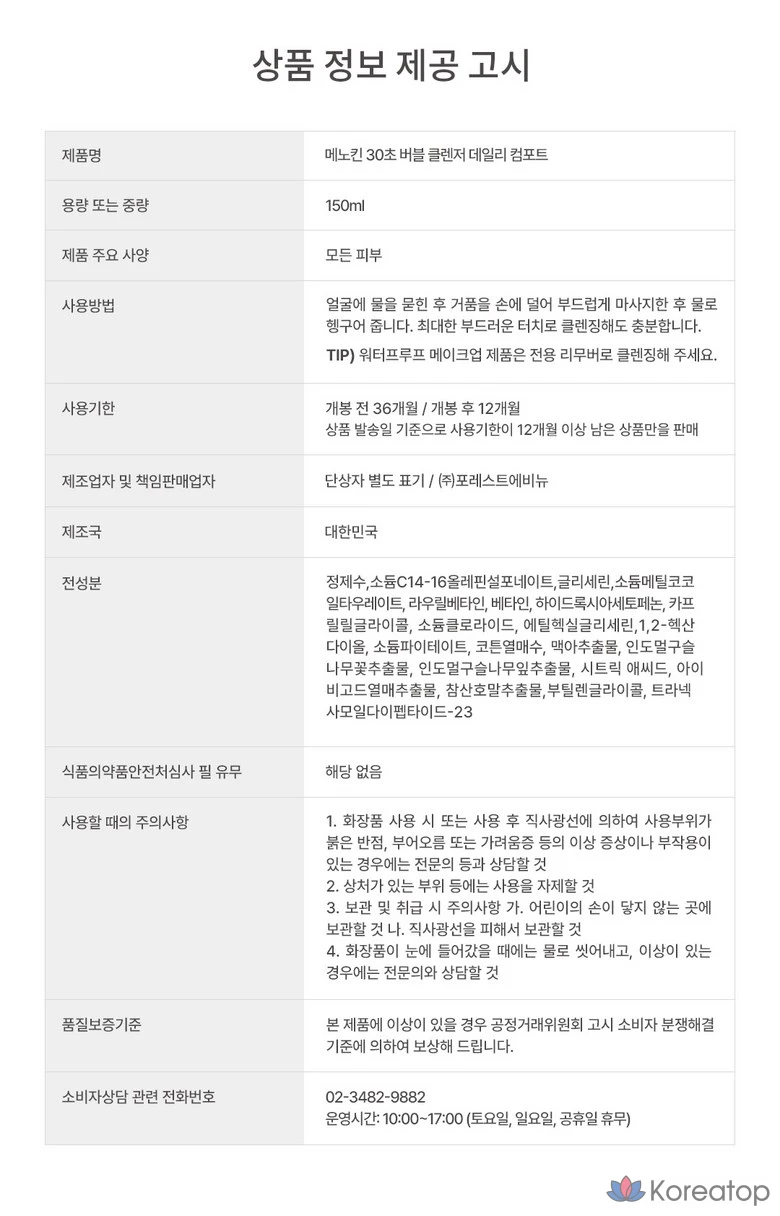 Очищающее средство для лица MENOKIN 30-Second Bubble Cleanser Daily Comfort, 1 шт., 150 мл