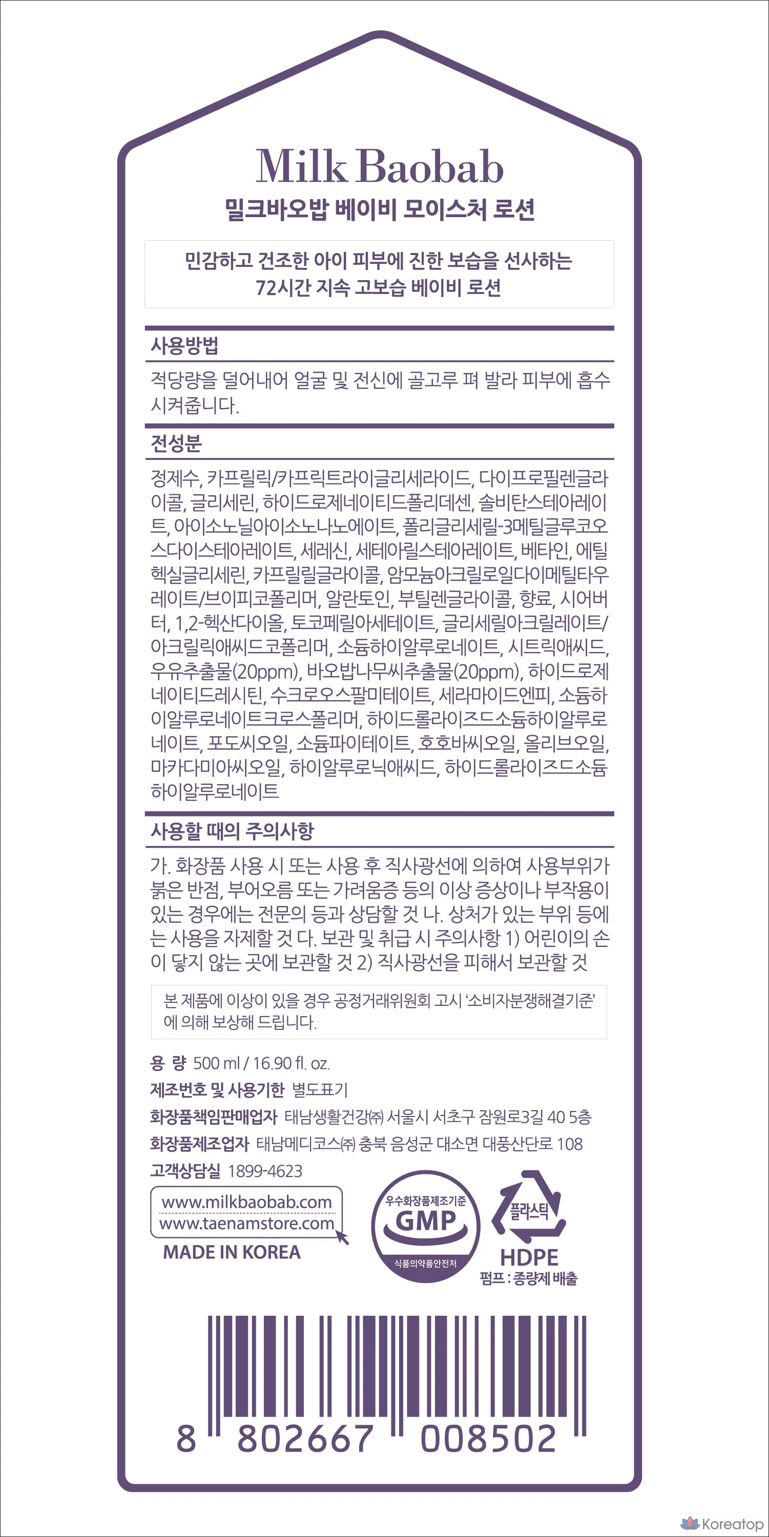 Детский лосьон Milk Baobab 500 мл, Увлажняющий детский лосьон 500 мл, 1 комплект