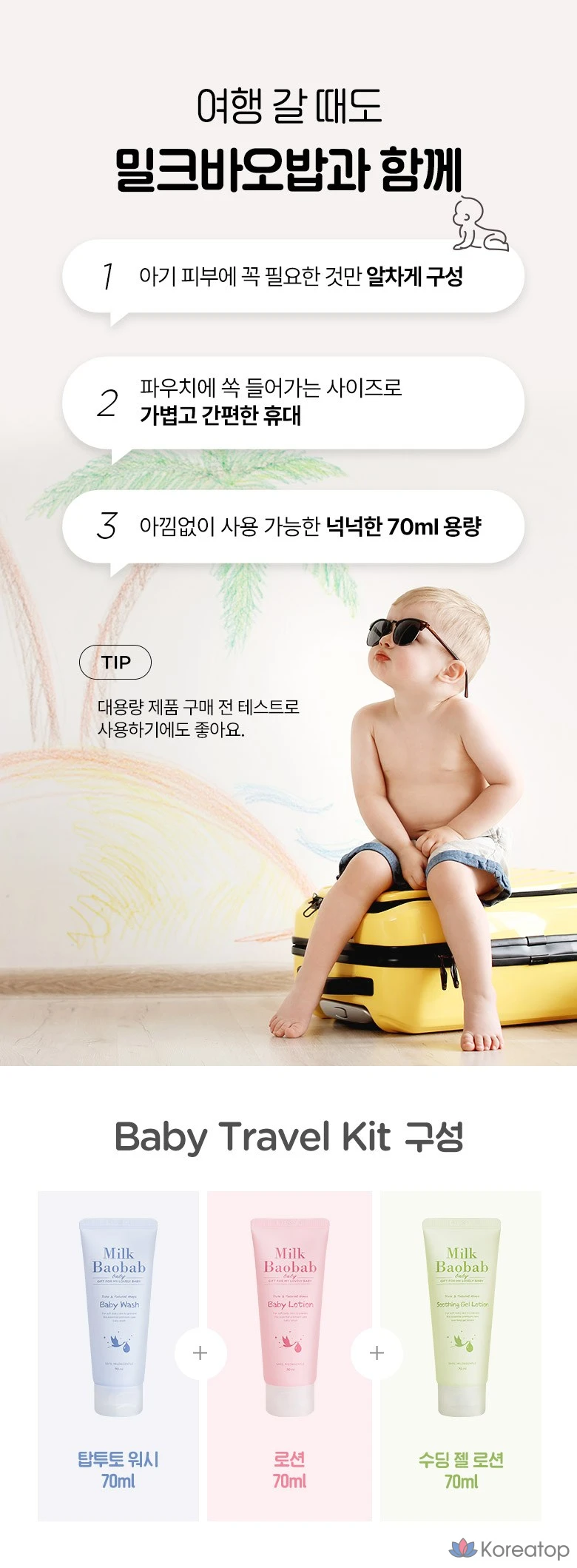 Milk Baobab Baby Travel Kit — это набор из трёх средств по 70 мл, специально разработанных для ухода за нежной кожей малышей во время путешествий. В комплект входят мягкое средство для умывания, увлажняющий лосьон для тела и успокаивающий гель-лосьон с натуральными экстрактами. Компактный размер каждого средства делает набор идеальным спутником в дороге, обеспечивая полноценный уход за кожей ребёнка в любых условиях. 🌟