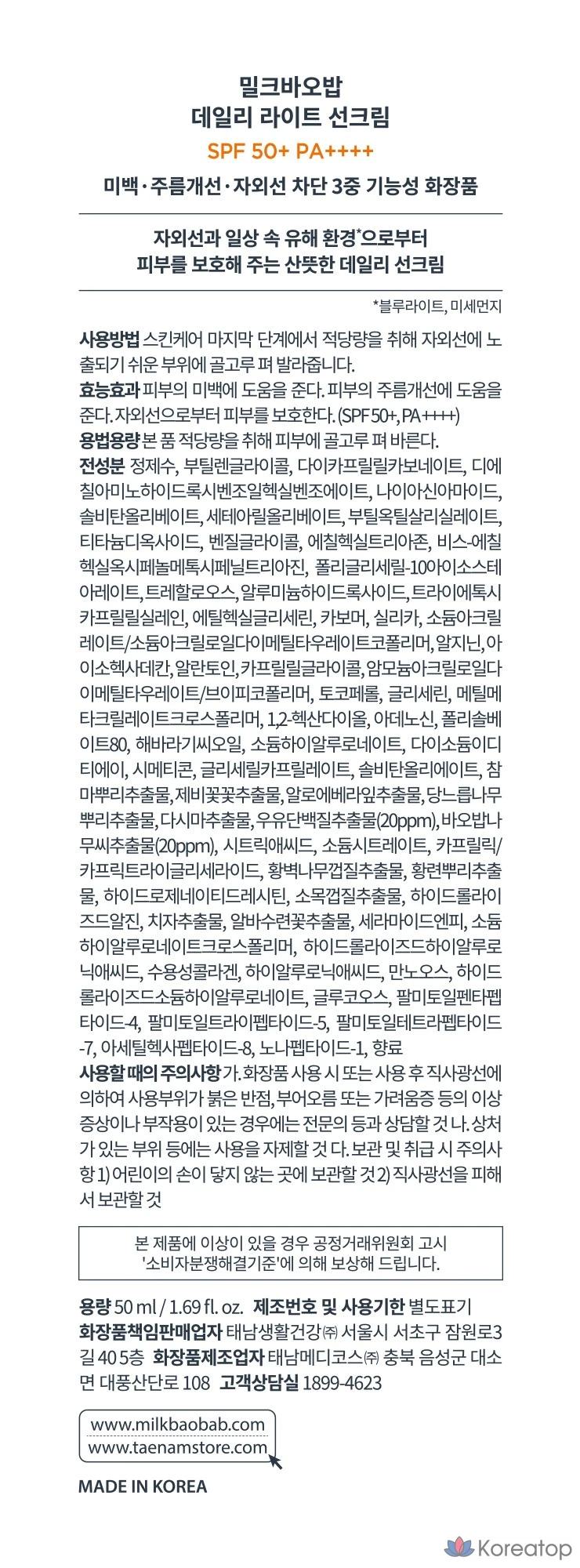Солнцезащитный крем Milk Baobab Daily Light Sunscreen SPF50+ PA++++, 1 шт., 50 мл