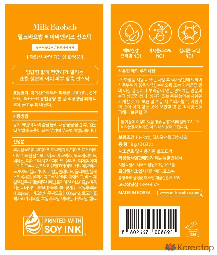 Солнцезащитный стик Milk Baobab для детей и младенцев SPF50+ PA++++, 18 г, 1 шт.