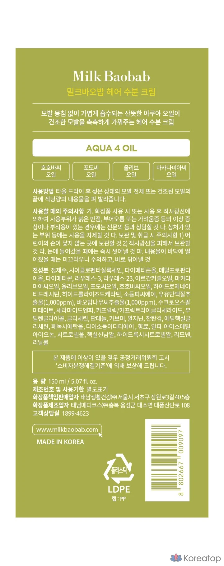 Увлажняющий крем для волос Milk Baobab, 150 мл, 1 шт.