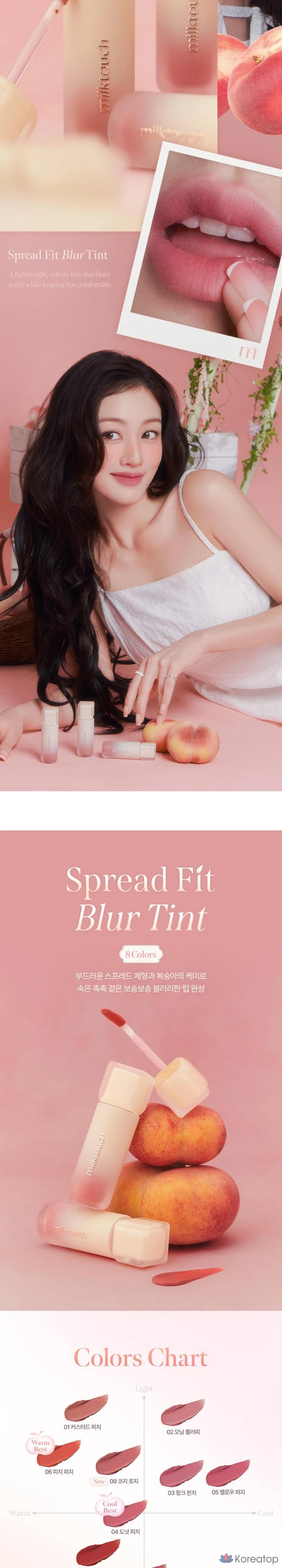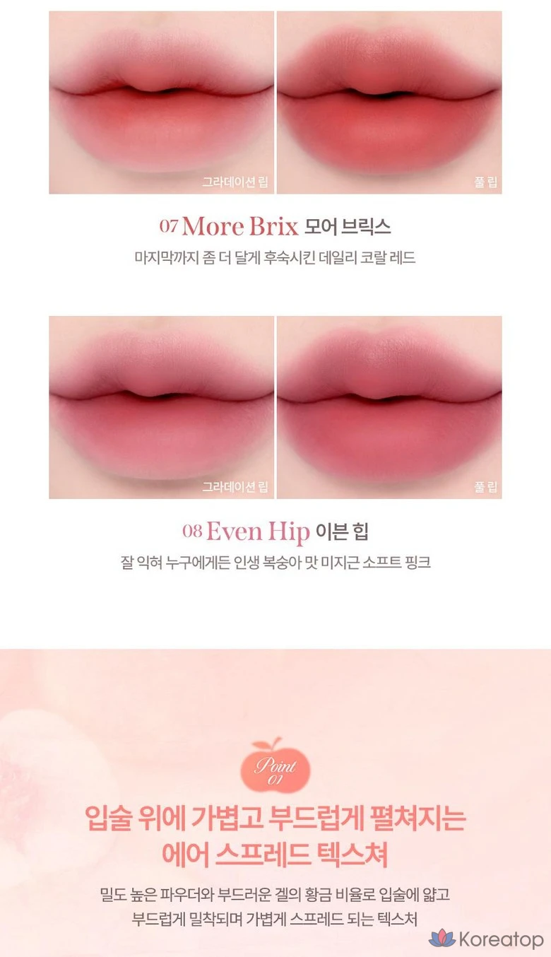 Воздушный тинт с технологией Spread Fit создает эффект мягкого размытия. Легкая текстура комфортно ложится на кожу, обеспечивая естественный румянец. Формула быстро впитывается, не оставляя липкости. Идеален для создания популярного корейского макияжа. 💫