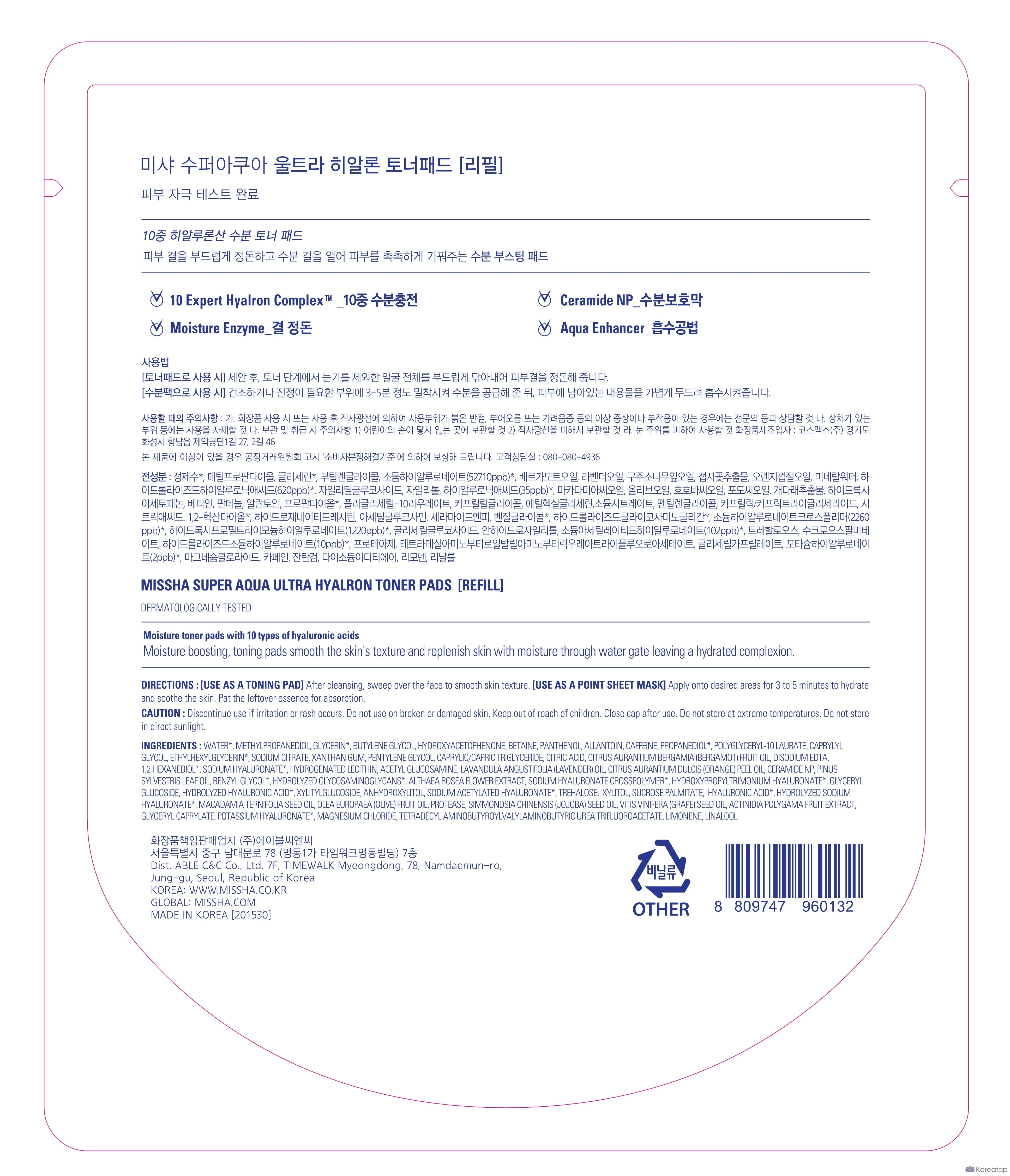 Сменные подушечки для тоника Missha Super Aqua Ultra Hyalron, 180 г, 90 листов, 1 упаковка.