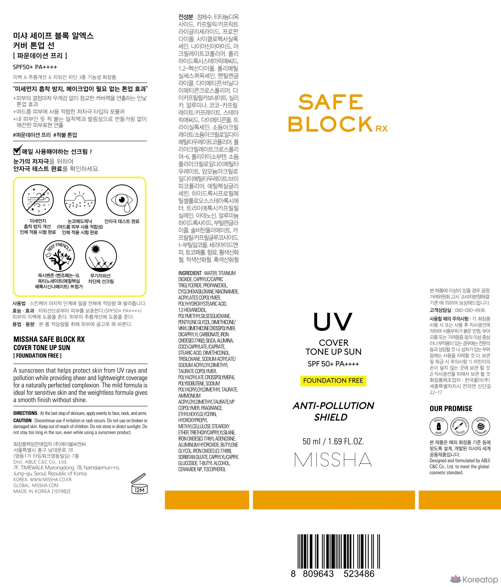 Солнцезащитный крем Missha Safe Block RX Cover Tone-Up SPF50+ PA++++, 50 мл, 1 шт.