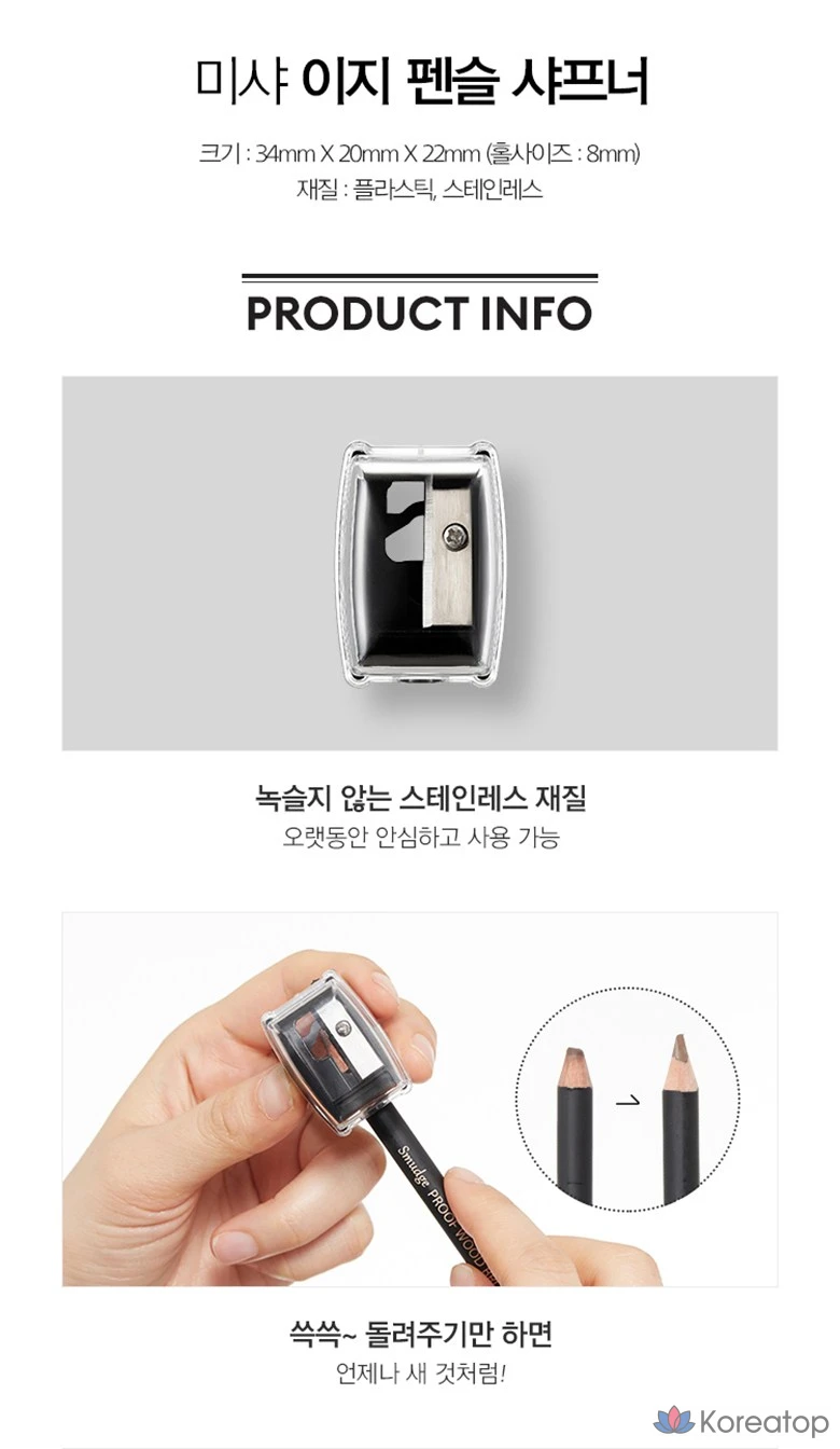 Missha Easy Pencil Sharpener — удобная точилка для стандартных косметических карандашей. Оснащена острыми лезвиями из нержавеющей стали, обеспечивающими аккуратную заточку без повреждения грифеля. Съёмный контейнер собирает стружку, поддерживая чистоту в косметичке. Компактный размер делает её идеальной для использования дома и в дороге. 😊