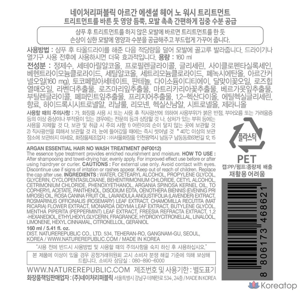 Nature Republic Argan Essential Hair No-Wash Treatment, 160 мл, 1 шт.