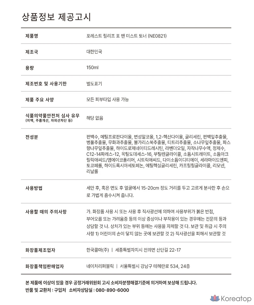 Тоник-спрей Nature Republic Forest Relief для мужчин, 150 мл, 1 шт.