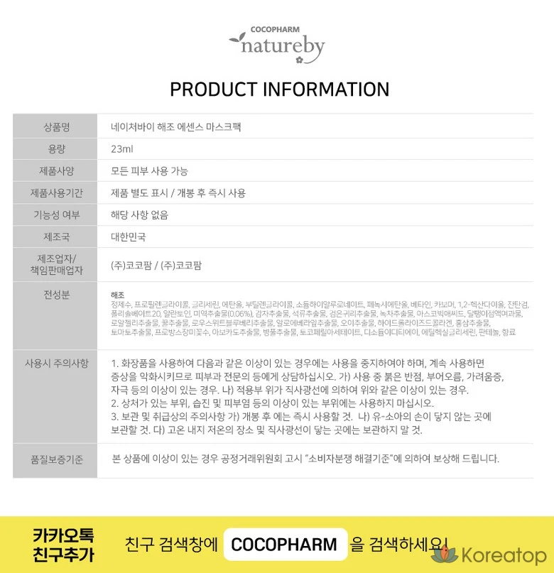 Маска для лица Natureby Essence Mask Pack с морскими водорослями, 23 г, 1 упаковка, 50 штук