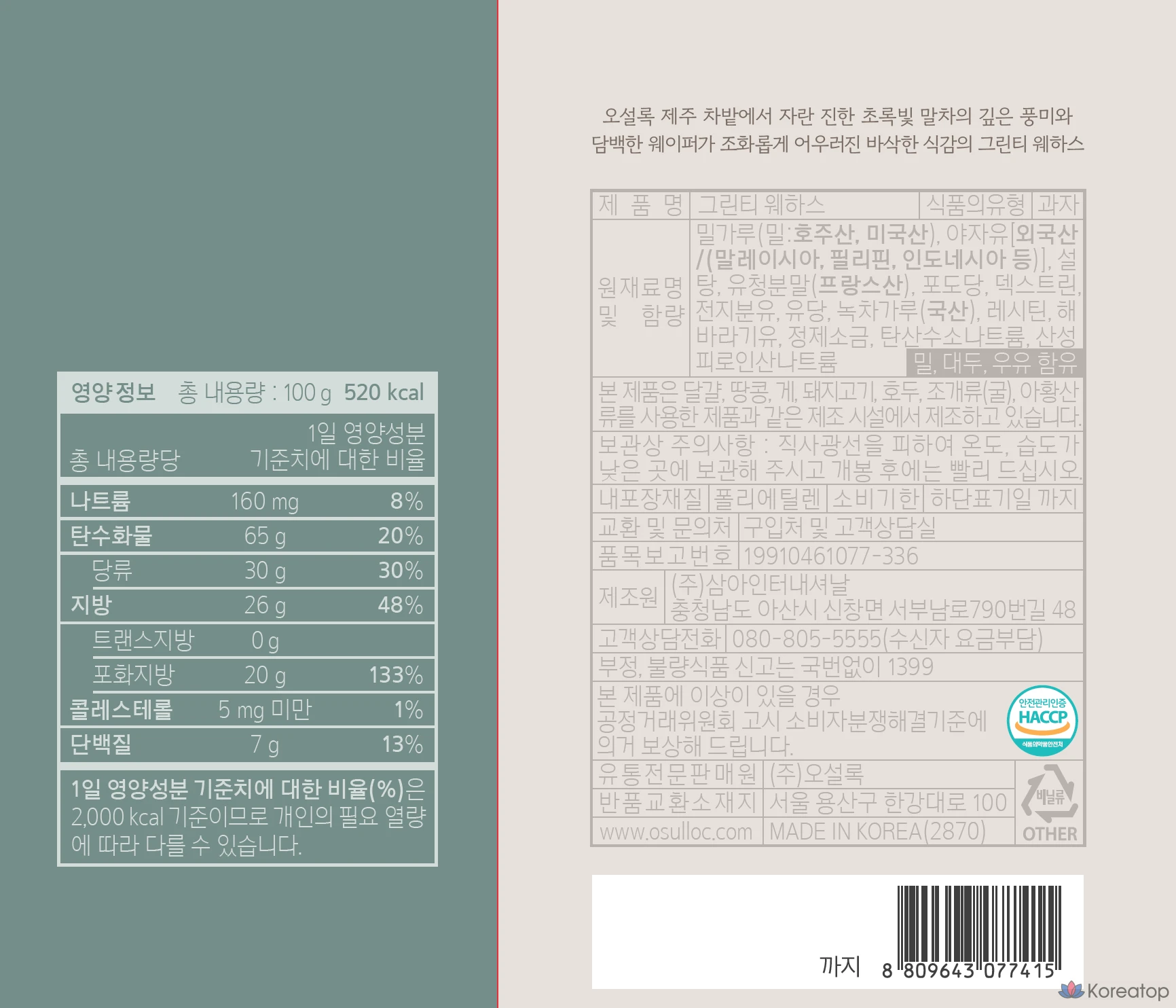 Вафли с зеленым чаем Osulloc — это изысканное сочетание хрустящей текстуры и натурального вкуса зеленого чая. Эти вафли станут отличным дополнением к вашему утреннему чаю или кофе, добавляя нотку свежести и аромата. Удобная упаковка позволяет брать их с собой в дорогу или на работу, чтобы насладиться вкусным перекусом в любое время. Органический состав и натуральные ингредиенты делают этот продукт не только вкусным, но и полезным выбором для вашего рациона. 🍵