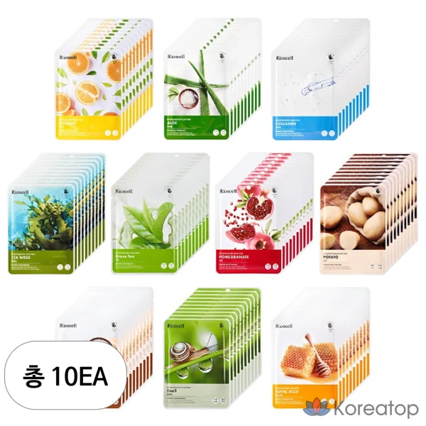 Маска для лица Ricocell Nature Recovery Mask Pack, 100 листов, 10 видов: увлажняющие, питательные, витаминные, коллагеновые, с алоэ, огурцом, картофелем и рисом компонентов, 1 упаковка