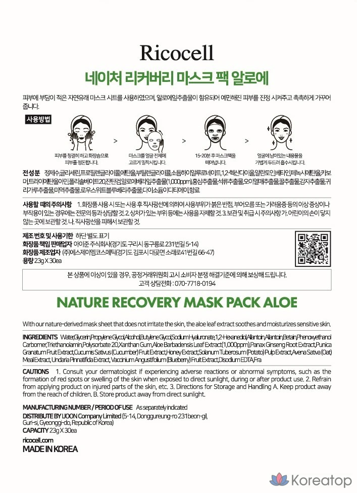 Набор масок Ricocell Nature Recovery Aloe Mask Pack, 23 г, 10 штук, 1 упаковка.