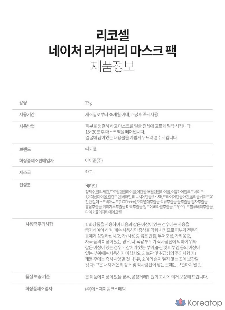 Набор витаминных масок Ricocell Nature Recovery, 23 г, 1 упаковка, 10 штук.
