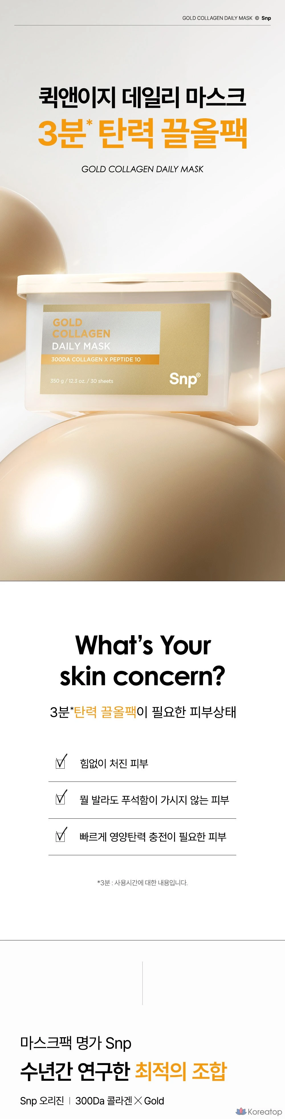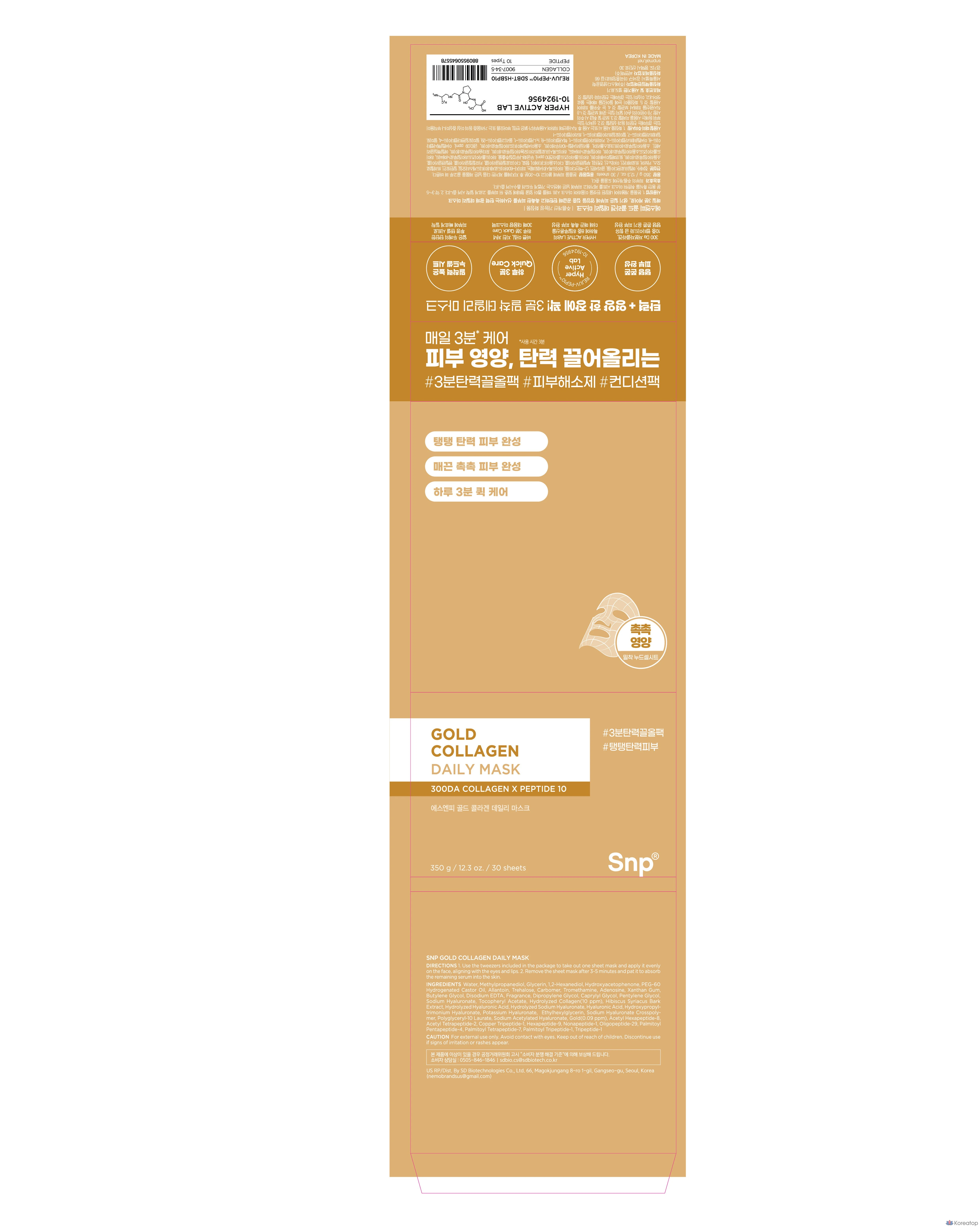 Набор масок SNP Gold Collagen Daily Extract Mask Pack, 350 г, 30 штук, 1 упаковка