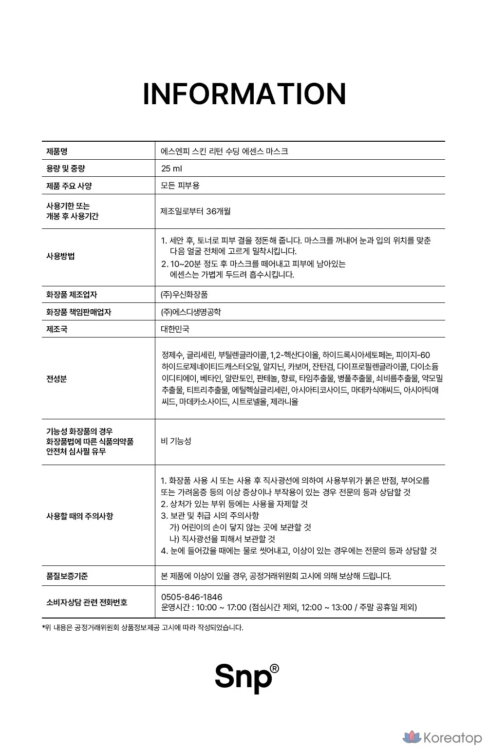 Набор успокаивающих эссенциальных масок для лица SNP Skin Return, 1 упаковка, 10 листов.