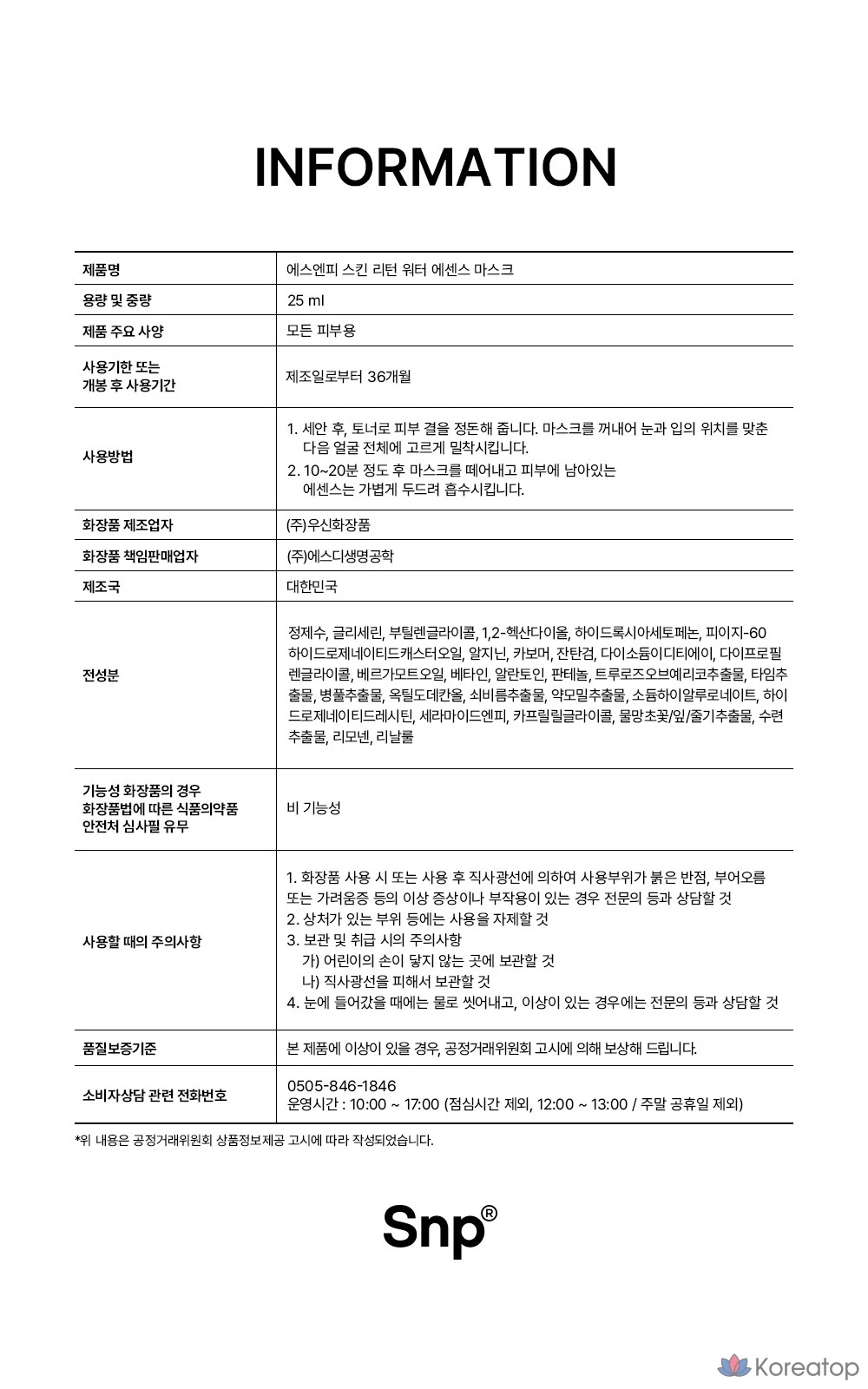 Набор увлажняющих масок SNP Skin Return Water Essence, 1 упаковка, 10 штук.