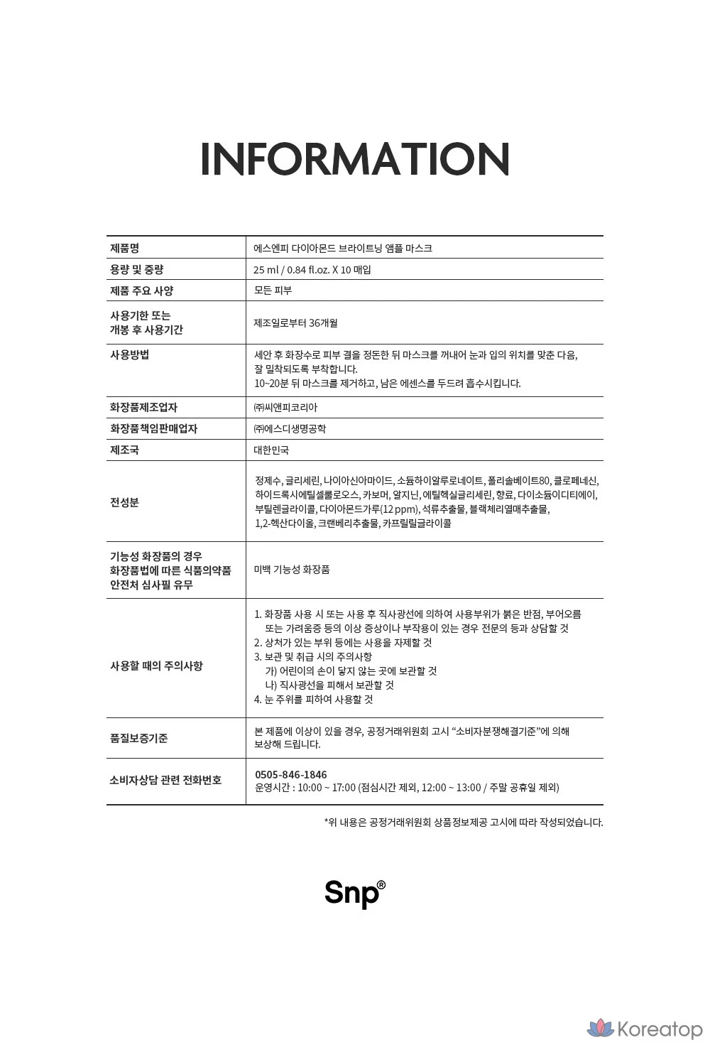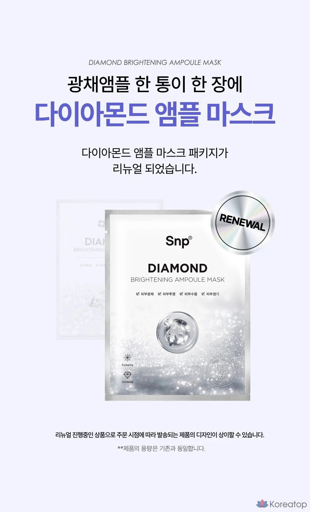 Осветляющая ампульная маска для лица SNP Diamond Brightening Ampoule Mask, 30 штук, 1 упаковка.