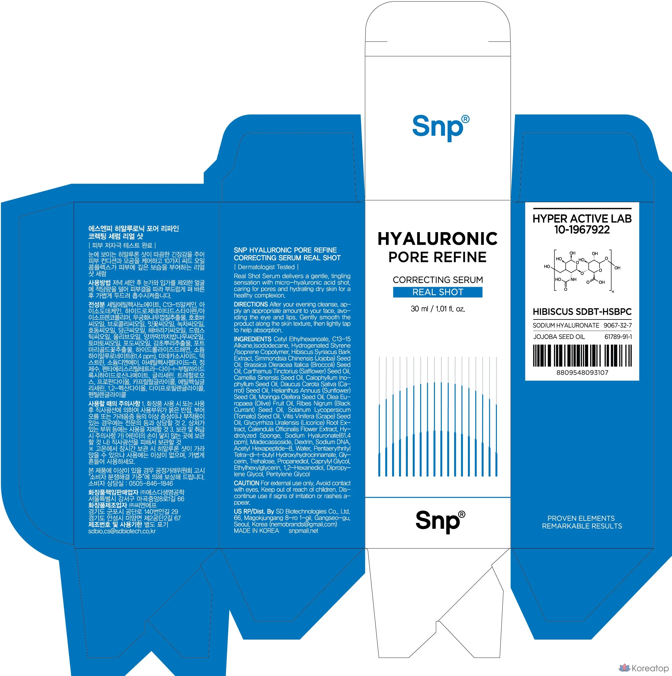 Сыворотка для сужения пор SNP Hyaluronic Spicule Pore Refining Correcting Serum Real Shot, 30 мл, 1 шт.
