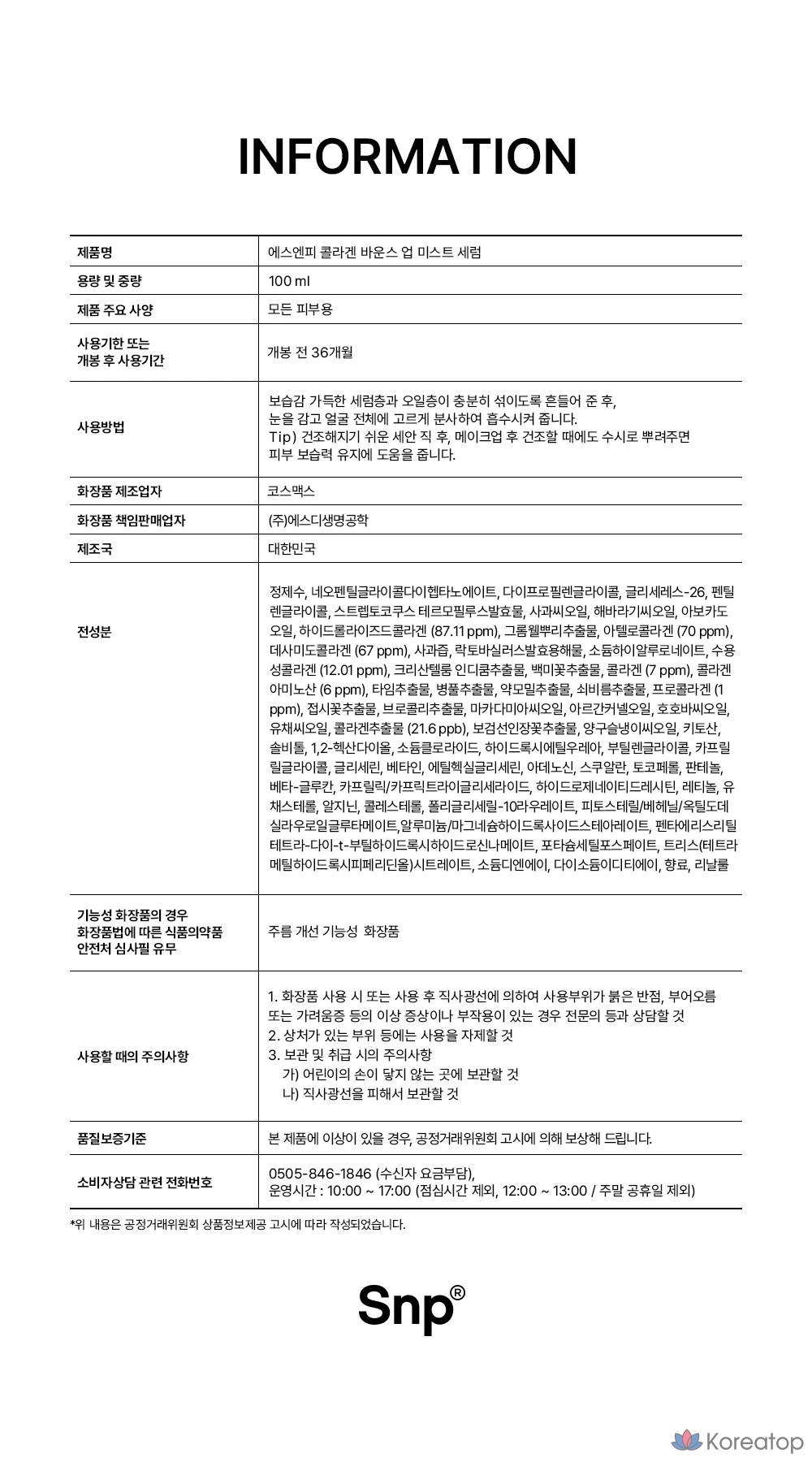 Сыворотка-спрей SNP Collagen Bounce Up Mist Serum, 100 мл, 1 шт.