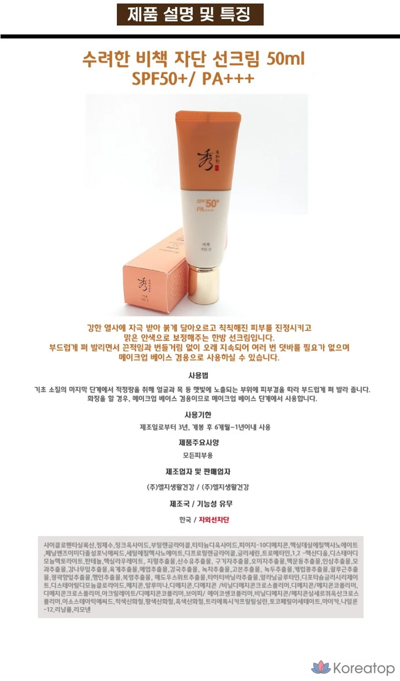 Su-ryeon Bichaekjadan Sunscreen SPF50+ PA+++, 50 мл, 1 шт.