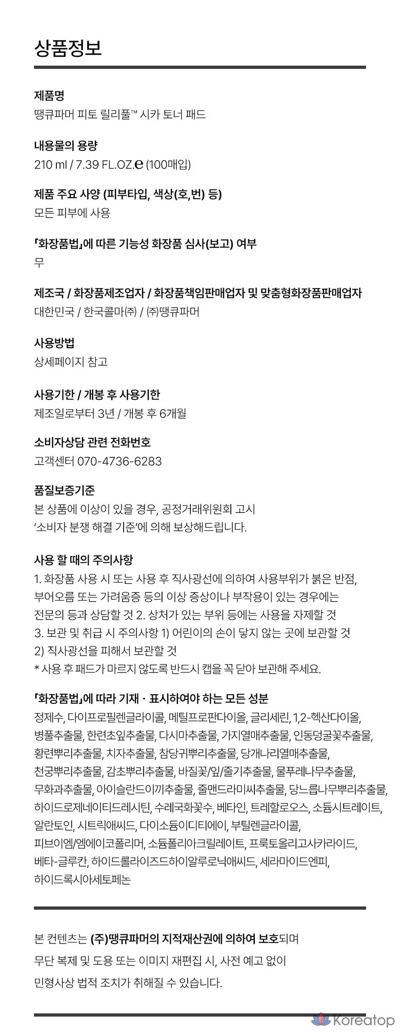 Тонизирующие подушечки для лица Thank You Farmer Phyto Lilyful Cica, 210 мл, 100 листов, 1 шт.