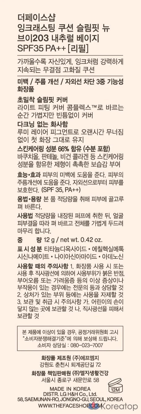 Тональный крем-кушон The Face Shop Ink Lasting Slim Fit New Cushion Foundation Refill, 12g, V201 Apricot Beige, 1 шт.
