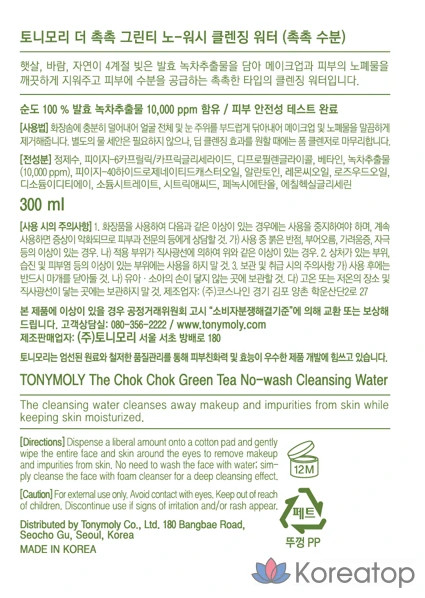 Очищающая вода Tony Moly The Chok Chok с зеленым чаем без смывания, 300 мл, 1 шт.