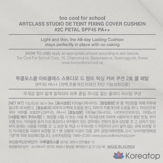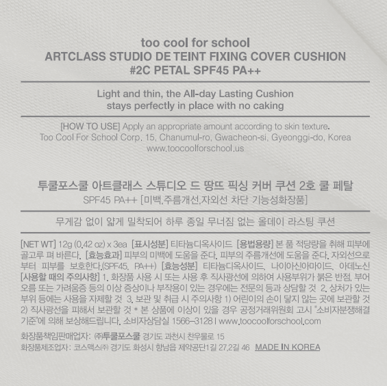 Тональный крем-кушон Too cool for school Art Class Fixing Cover Cushion (12 г основного продукта + 2 сменных блока) SPF 45+/PA++ Коррекция тона кожи, придание сияния, осветление, защита от УФ-излучения, защита от веснушек, успокаивающий и укрепляющий эффект, 1 шт.