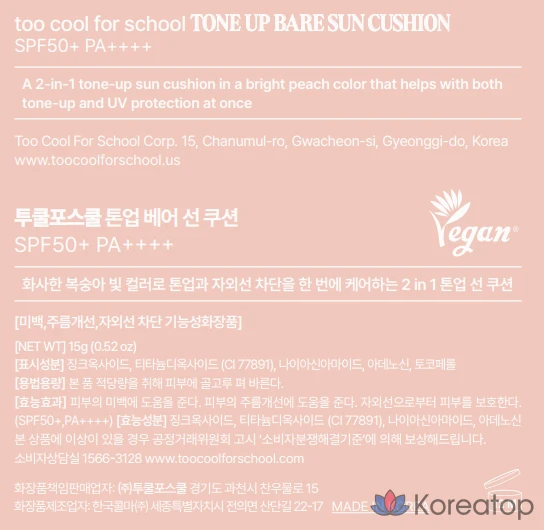Солнцезащитный кушон Too Cool For School Tone Up Bare обеспечивает надежную защиту от ультрафиолетовых лучей благодаря SPF50+ и PA++++. Легкая текстура средства равномерно распределяется по коже, создавая естественный тональный эффект и придавая лицу свежий вид. Увлажняющий состав помогает поддерживать оптимальный уровень влаги в течение всего дня, предотвращая сухость и дискомфорт. Этот продукт идеально подходит для ежедневного использования, обеспечивая комфорт и защиту в любое время года. ☀️