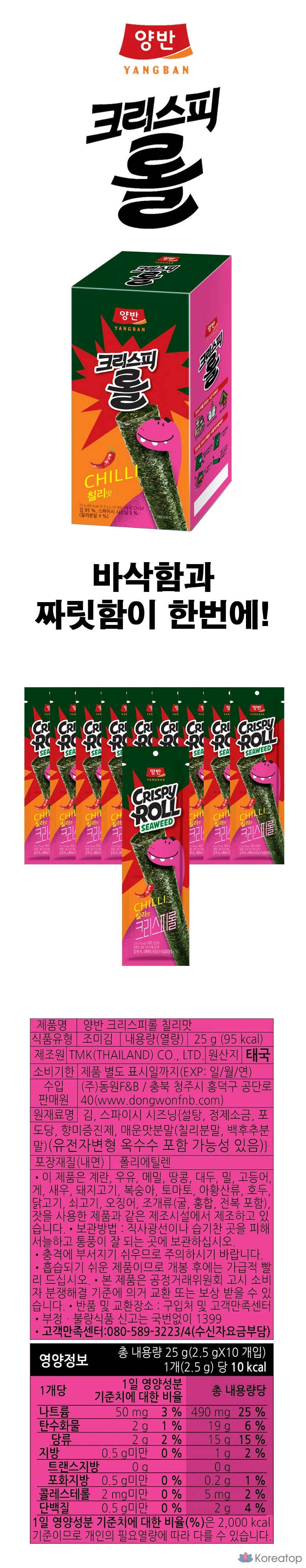 Хрустящие роллы с чили Yangban Kim Snack — это идеальный выбор для любителей острого. Эти роллы изготовлены из натуральной морской капусты и приправлены пикантным чили, что придаёт им уникальный вкус. Удобная упаковка позволяет брать их с собой в дорогу или наслаждаться ими дома. Прекрасно подходят для быстрого перекуса или дополнения к основному блюду. Попробуйте и ощутите настоящий вкус Азии! 🌶️