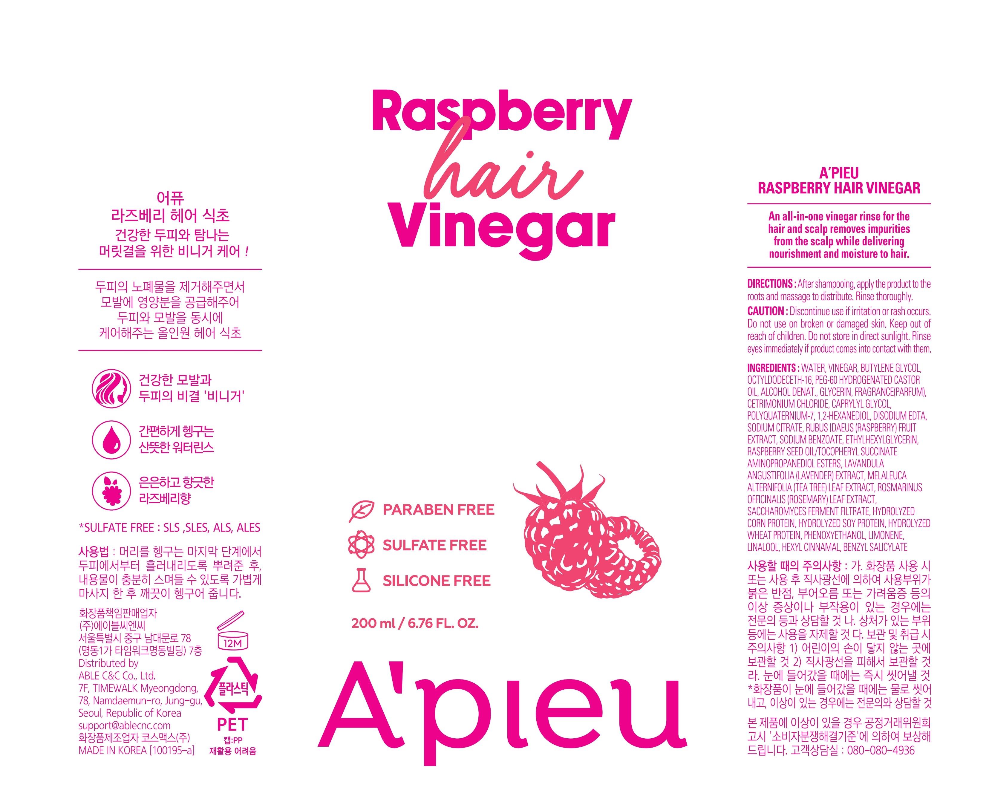 Ополаскиватель для волос A'Pieu с малиновым уксусом, 200 мл, 1 шт.