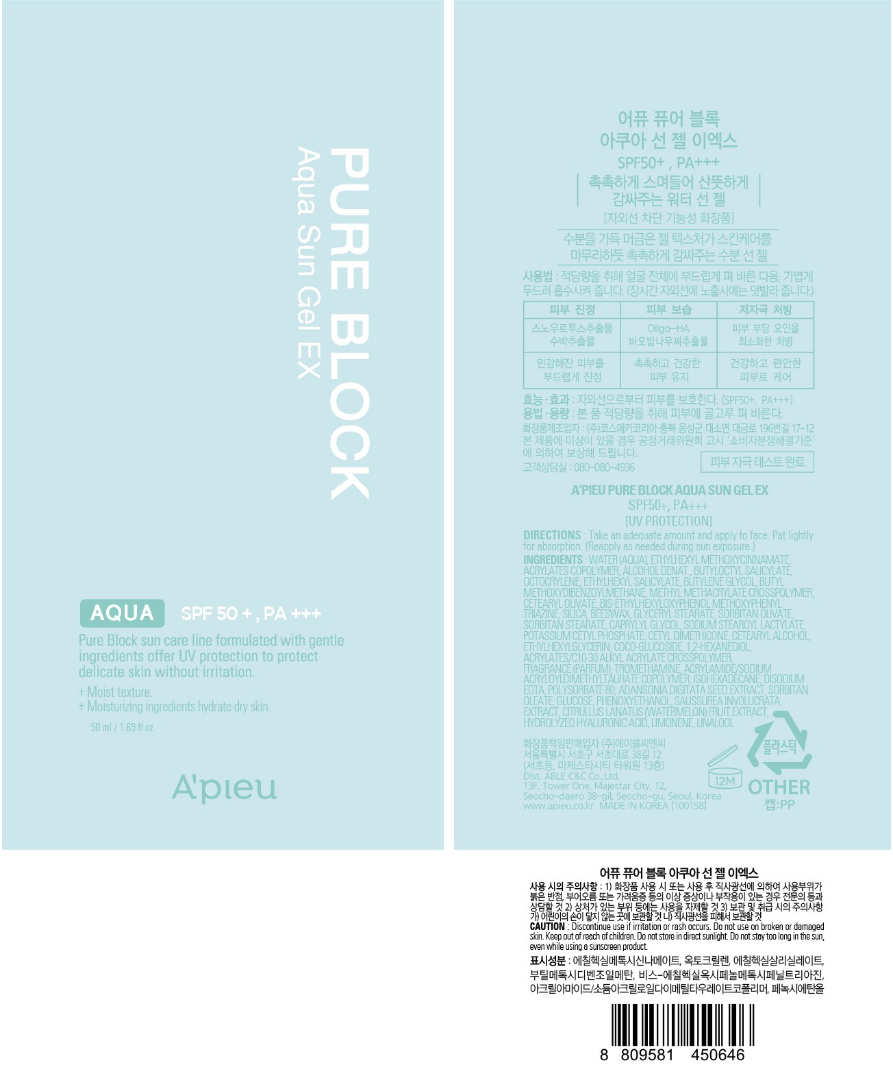 Солнцезащитный гель A'Pieu Pure Block Aqua Sun Gel EX SPF50+ PA+++, 50 мл, 1 шт.