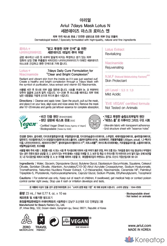 Маска для лица Ariel Seven Days Mask Lotus N, 23 мл, 1 упаковка, 1 шт.