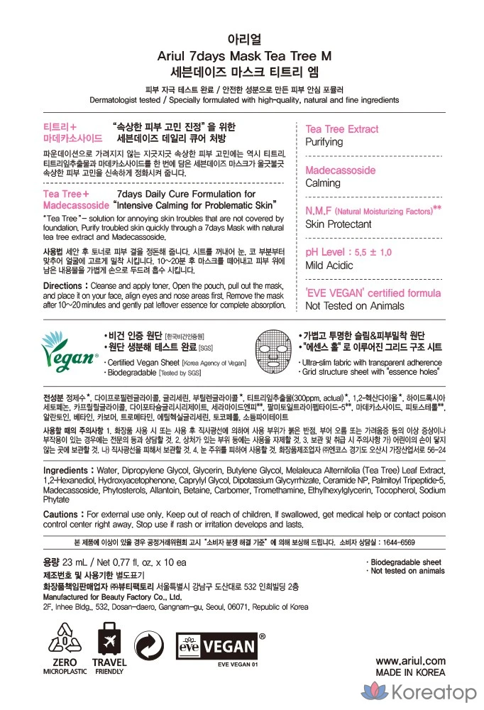 Маска для лица Ariel Seven Days Tea Tree M, 230 мл, 1 упаковка, 10 штук.