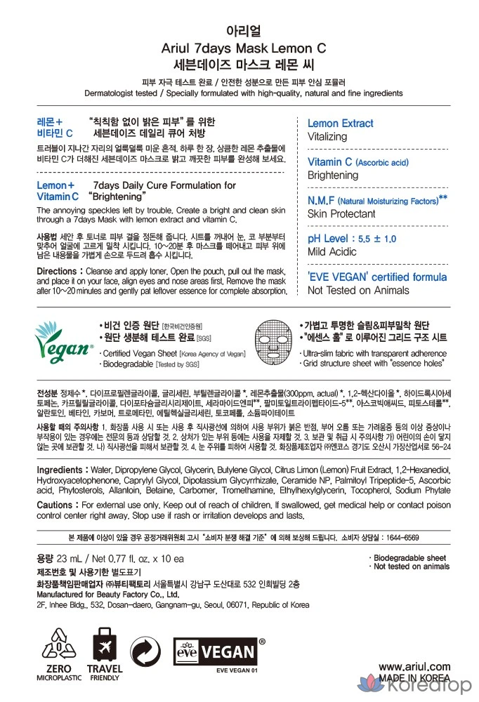 Набор тканевых масок для лица Ariel Seven Days Lemon Mask Pack Sheet, 1 упаковка, 1 шт.