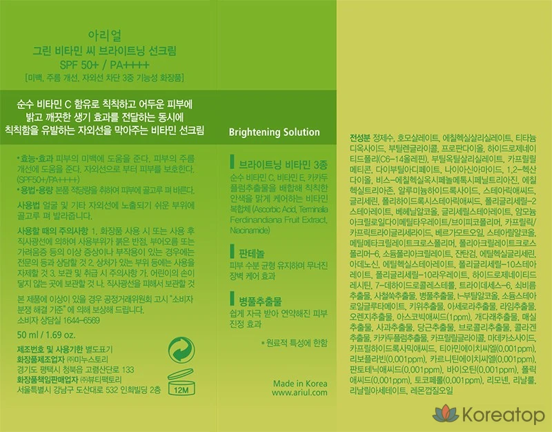Солнцезащитный крем Ariel Green с витамином С, осветляющий кожу, SPF 50+ PA++++, 1 шт., 50 мл