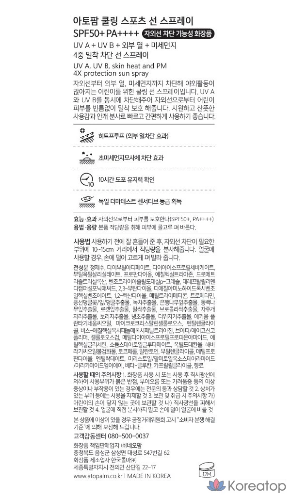 Охлаждающий спортивный солнцезащитный спрей Atopalm для детей SPF50+ PA++++, 100 мл, 1 шт.