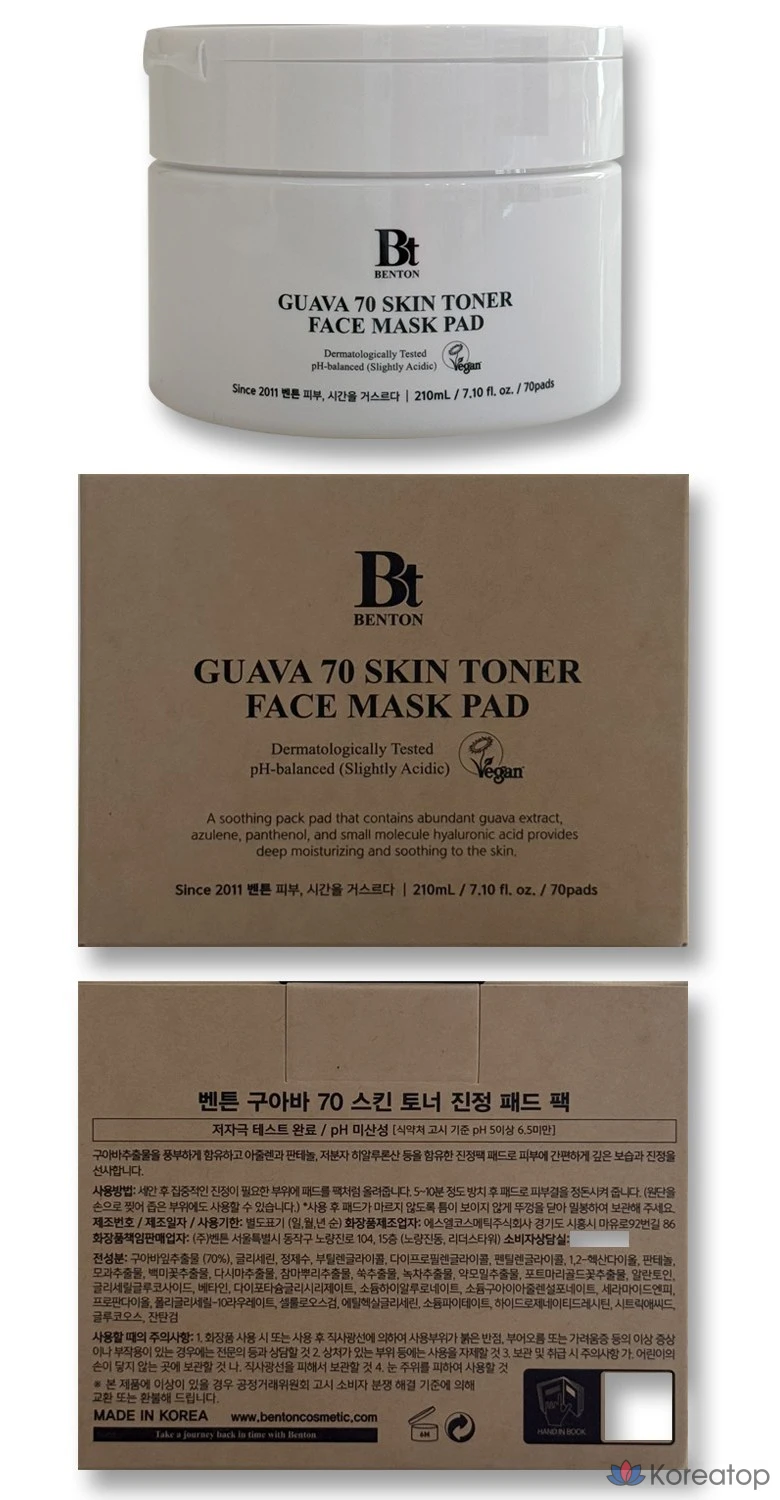 Тонизирующие подушечки для лица Benton Guava, 70 шт., 70 листов. Подушечки для лица Hwajalmeok Panthenol King, 70 листов, 1 упаковка.
